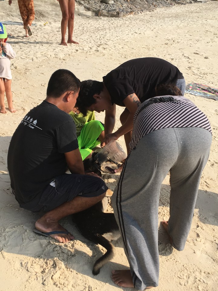 Gestern war plötzlich ein Jaulen am Strand zu hören. Drei Thais versuchten verzweifelt einen Hund aus einer Plastikbox zu begreifen. Wahrscheinlich hat der Hund versucht darin etwas zu schlecken und ist mit samt dem ganzen Kopf darin stecken geblieben. Ein Thai hielt den Hund fest. Ein Anderer schnitt mit einem Messer ein erstes Atemloch hinein. Unsere Nachbarn eilten noch mit einer Schere zu Hilfe. So brachte der Thai den grössten Teil des Plastikbehälters ab, doch um den Hals blieb ein starrer Plastikreif, den sie nicht zerschneiden konnten. Der Hund hatte zum Glück einen schmalen Kopf, so dass der Mann ganz vorsichtig den Reifen vom Hundehals schieben konnte. Der Hund machte nach seiner Rettung vor Freude Luftsprünge.