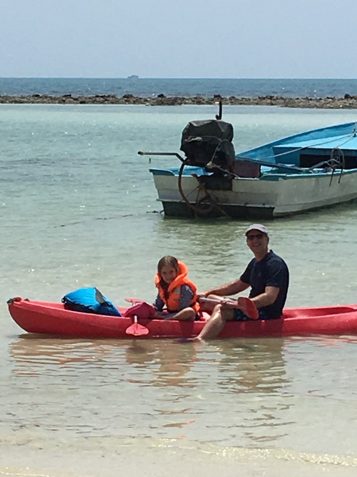 Heute war prächtiges Wetter. Entsprechend warm war das Wasser in unserer Lagune (wir schätzen 30-40 Grad). Nach einem gemütlichen Morgen machten Josephine und ich uns auf zu einem Kanuabenteuer. Wir mieteten ein Kanu und paddelten zur nächsten Bucht. Unter uns sahen wir auf Grund der starken Ebbe das Korallenriff ganz nah. Zeitweise musste ich richtig gut steuern um heil durch die Korallenformationen durch zu kommen. Wir hatten geplant an guten Stellen noch etwas zu schnorcheln. Leider hatten wir nicht bedacht, dass das Kanu beim Ein- und Aussteigen auf dem offenen Meer kentern würde. So brauchte es gerade einige Minuten bis Josephine dem Kanufahren ohne Schnorcheln etwas abgewinnen konnte.