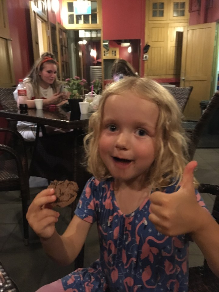 Nun hiess es Einchecken, Gepäck ablegen, Restaurant suchen und möglichst rasch was essen. So landeten wir beim chinesischen Nachbarrestaurant. Wir waren froh als das Essen nach einer gefühlten Ewigkeit serviert wurde. Leider war Gioia zu müde um sich auf „unbekanntes“ Essen einzulassen. So hiess es nach dem Essen noch irgendeinen Snack auftreiben, damit wir nicht mitten in der Nacht mit einem weinenden hungrigen Kind im Hostel sitzen. So kauften wir eher widerwillig in einer chinesischen Apotheke noch eine Packung „Dützli“ und setzten uns noch auf die Terrasse im Innenhof unseres Hostels damit Gioia auch noch Nachtessen konnte.