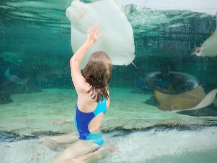 Danach über eine transparente Brücke, welche Sicht auf ein Delfinbecken erlaubt. Zum Schluss führt der Fluss an einem Becken mit diversen Fisch- und Rochenarten vorbei. Der Rochen bei Josephine heisst Cownose.