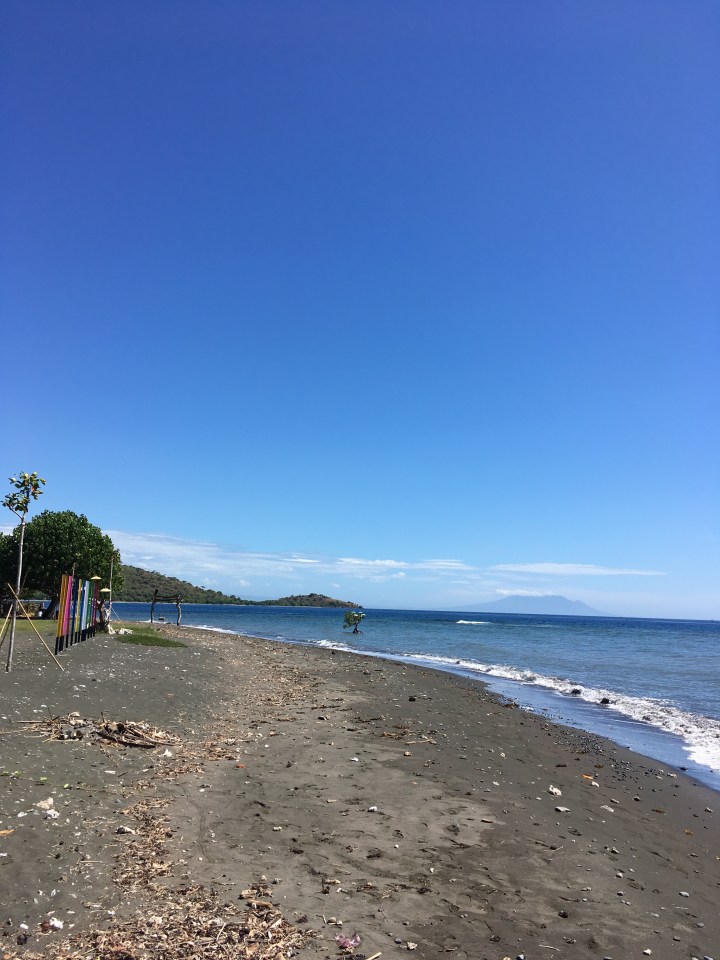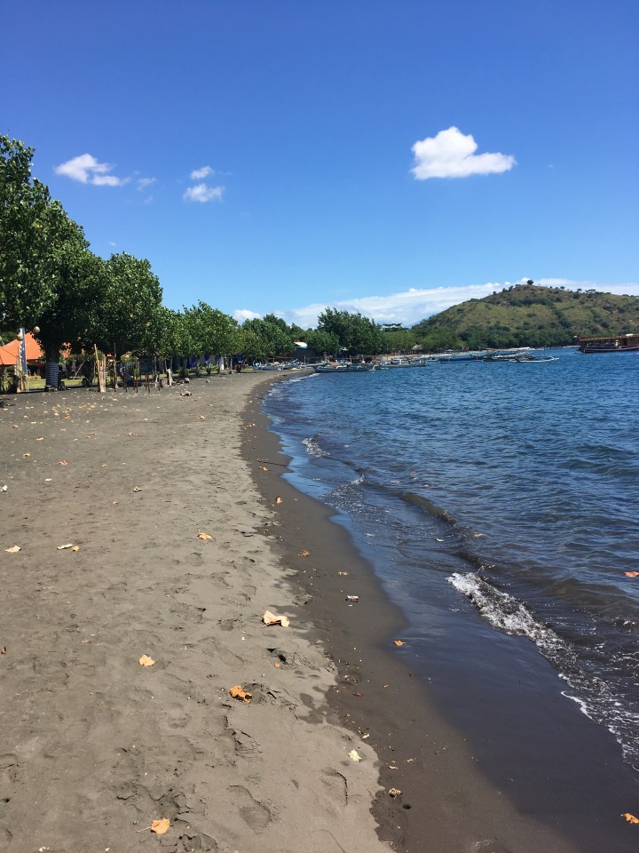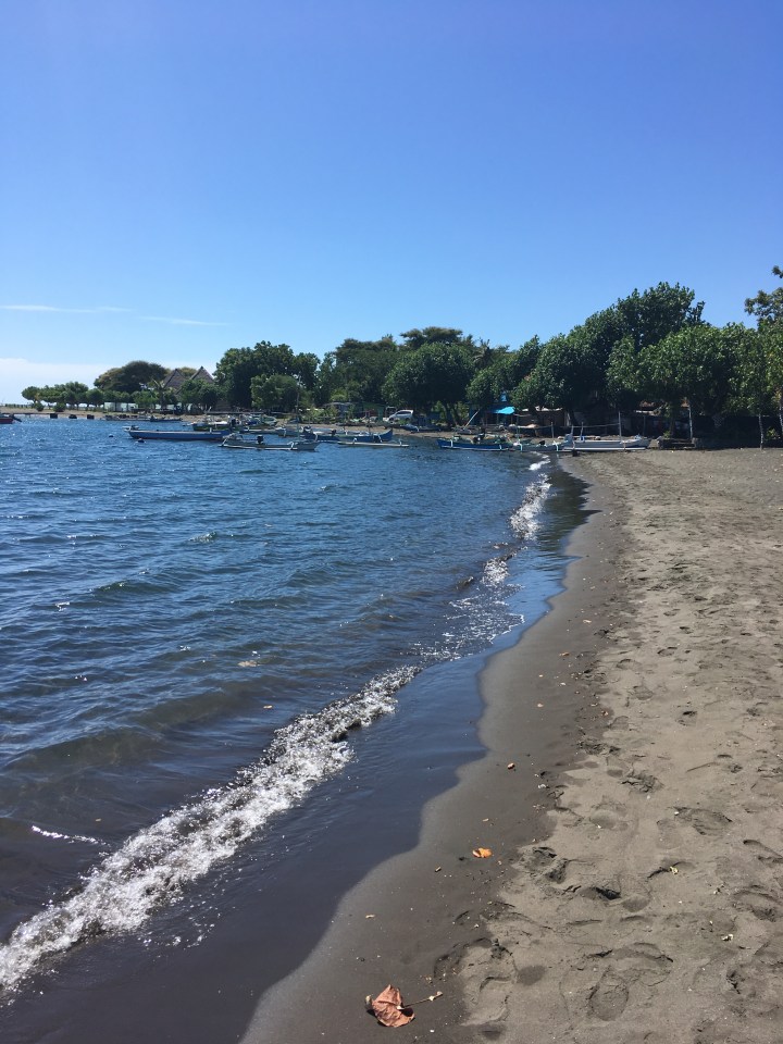 Das Meer ist hier offener und daher welliger. Die Strände bestehen aus schwarzem Sand, welcher wenn die Sonne scheint ohne Schuhe nicht begehbar ist. Ich lief dem Strand entlang auf der Suche nach einem Boot für einen Ausflug ins Naturschutzgebiet Menjangan.