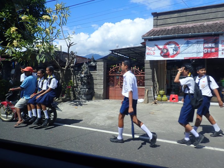 Der Verkehr: Bali hat ein Verkehrsproblem. Die meisten Strassen haben nur 1 Spur in jede Richtung. Mit all den Autos und Rollern gibt es aber oft so viel Verkehr, dass unser Auto mit 40-45 dahin tuckert. Ist die Strasse mal frei wird etwa 55 km/h gefahren, doch es dauert nicht lange, dann muss das Auto wieder wegen einem Hund, Huhn, Mensch, Roller oder Auto abgebremst werden.