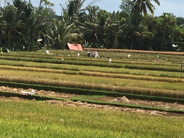 Unser Ziel war das Sari Organic. Ein kleines natürliches Restaurant umgeben von Reisfeldern. Das Schöne war, dass sich ausser uns nur sehr wenige Touristen hierher verlaufen. So kann man den Reisbauern bei ihrer Arbeit zuschauen, ohne dass man Touristenfänger abwimmeln muss. Josephine las gemütlich in den Kissen noch ihre Schullesehefte.