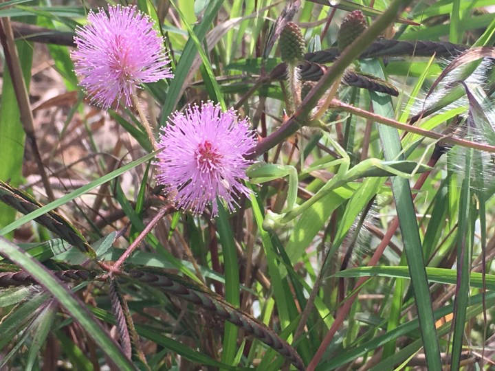 Die Modis tauchten dennoch voll in diese Idylle ein. Hier ein Schmetterling, da eine Gottesanbeterin, dort noch Käfer oder eine Mimose. Ja, Josephine war begeistert davon Mimosen zu finden (Blumen, welche sich bei einer Berührung zusammenziehen). So wanderte sie von Mimose zu Mimose: und auf einer sass tatsächlich eine grüne Gottesanbeterin.