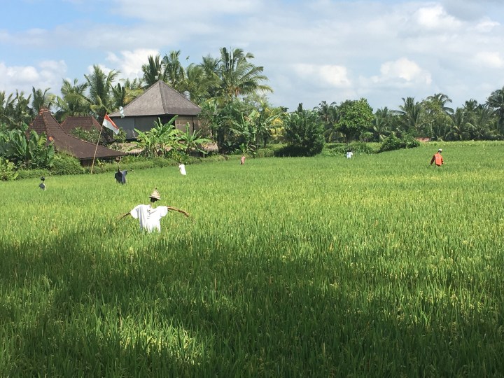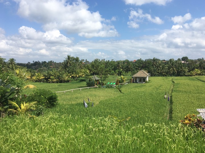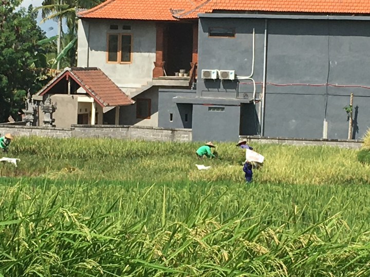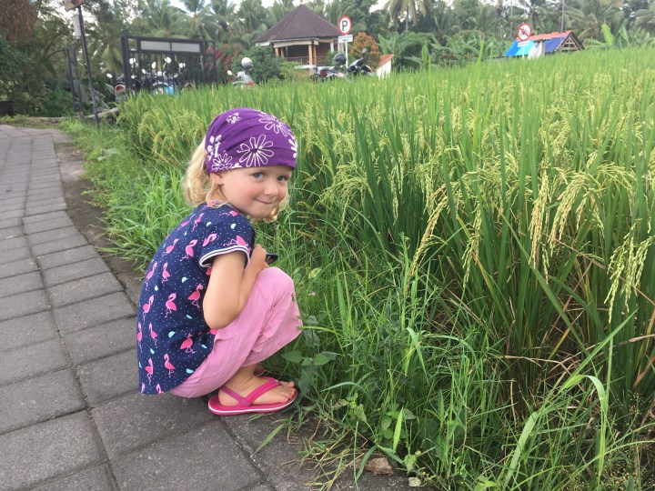 Heute standen die Reisfelder von Ubud auf unserem Reiseplan. Das hiess zuerst eine Stunde spazieren (in Kindertempo). Nach ca. 1km zweigte die Strasse ab vom Trubel von Ubud. Nun gab es nur noch einen „Fusswege“ zwischen einfachen Häusern, kleinen Reisbauernhöfen und Reisfeldern. Einziger Wermutstropfen waren zwischenzeitliche Roller, welche den „Fussweg“ für sich in Anspruch nahmen.