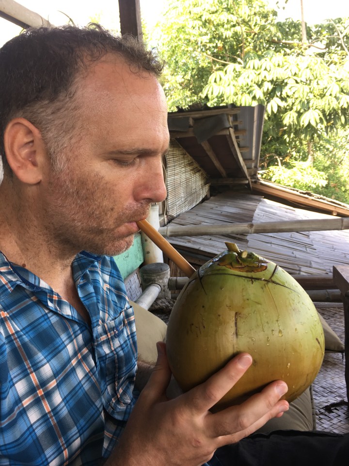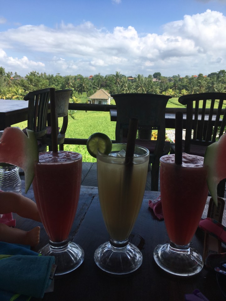Nach einer langen ruhigen Pause bei Melonen-, Zitronen-Ingwer-Shake und einer „jungen Kokosnuss“ machten wir uns langsam auf den Rückweg. Auf Bali werden immer mehr wiederverwendbare Bambusrohre als Trinkhalme verwendet anstelle von Plastikröhrli. Wenn jeder Balitourist und jeder Balinese täglich 1-2 Plastikröhrli braucht, entsteht nur schon damit ein riesiger Müllberg voll von Plastikröhrchen.