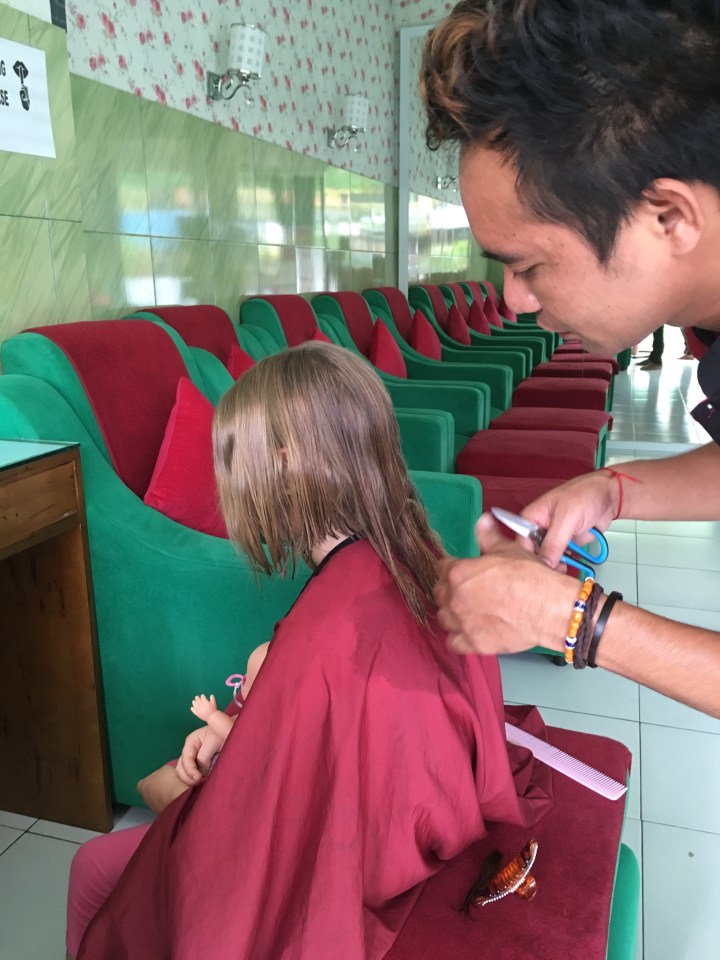 Aber ein Coiffeurstuhl war weit und breit keiner sichtbar. Dennoch fragten wir, ob sie wie angeschrieben auch Haare schneiden. Mit balinesischer Freundlichkeit lautete die Antwort: Yes!