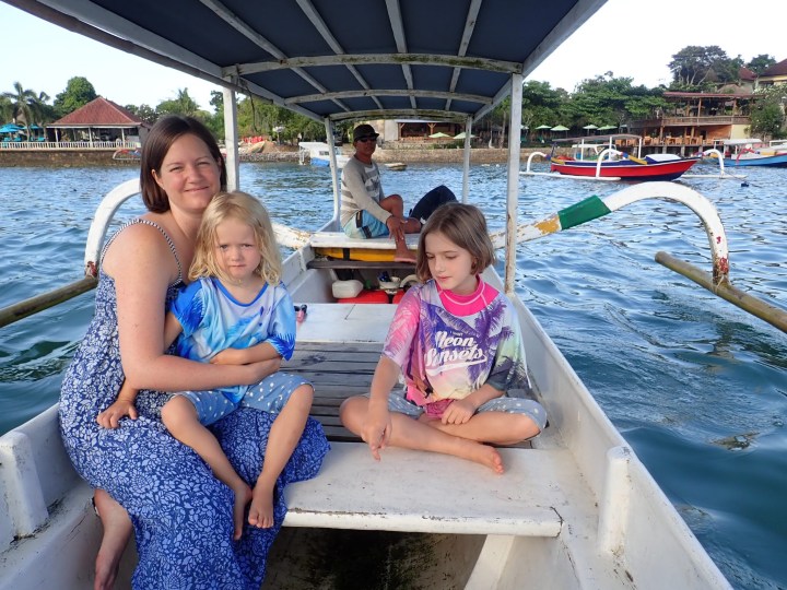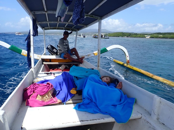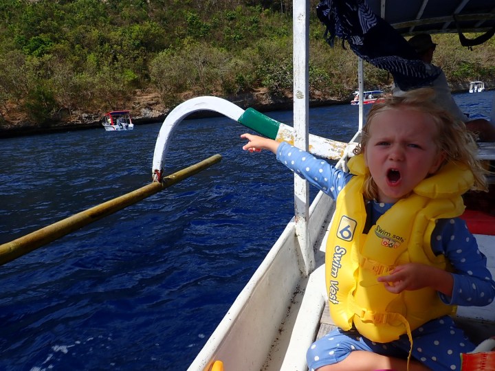 Cristal Bay liegt auf Nusa Penida in einer geschützten Bucht. Trotzdem hatte es ein wenig Wellen. Die Sicht war klar und es wimmelte von Fischen. Leider waren wir nicht die einzigen, die einen Schnorchelausflug machten. So tummelten sich etliche Boote in der Bucht. Da wir ein kleines Boot hatten, konnten wir etwas seitwärts am Rand einen guten Platz finden. Leider sind auch hier die Chinesen überall, nicht nur bei uns in den Bergen. Claude und ich schnorchelten ums Boot herum. Josephine wärmte sich unter einer Decke auf und erfand mit Gioia neue Lieder.
