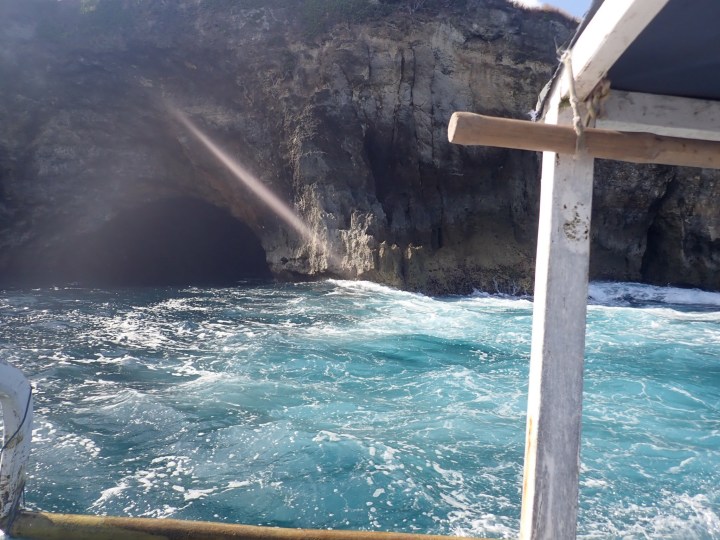 Die See war zu Beginn sehr rauh. Zuerst sind wir auf der einen Seite um Nusa Lembogan zur Insel Nusa Penida bis zum Manta Point gefahren. Das Wasser war wie erwartet saukalt (Neoprenanzüge wären jetzt nützlich gewesen). Josephine kam nach 5 Minuten wieder an Bord. Da die Sicht sehr schlecht war und Annina ein wenig übel vom Geschaukel auf dem Boot, beschlossen wir zur Cristal Bay zu fahren.