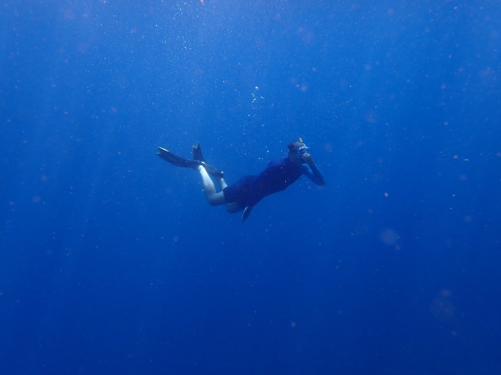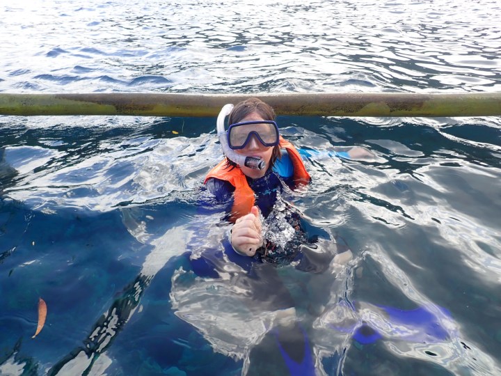 Josephine schnorchelt an 3 von 4 Stellen, aber nur kurz. Ohne Wetsuit ist das Wasser recht kalt. Danach kuschelt sich Josephine in ihr Tuch.
