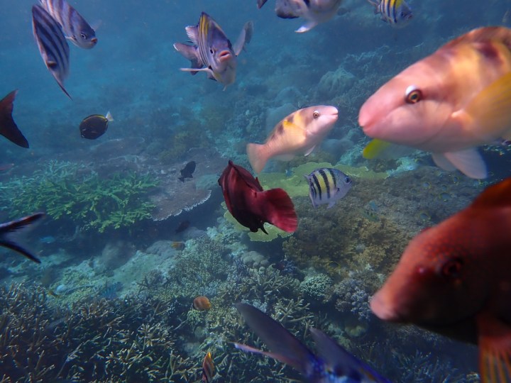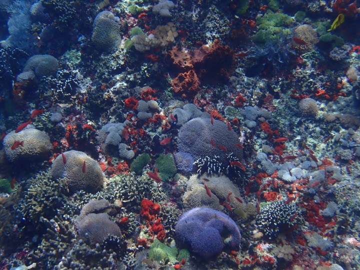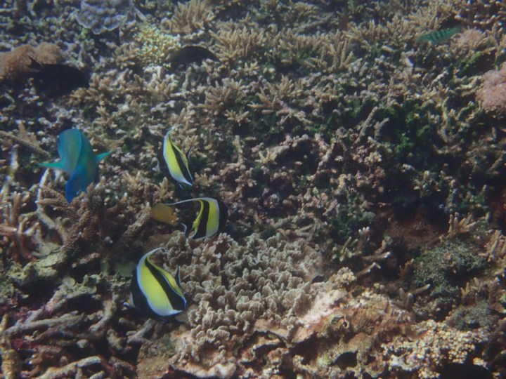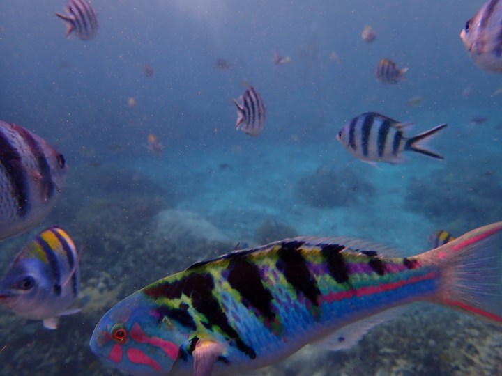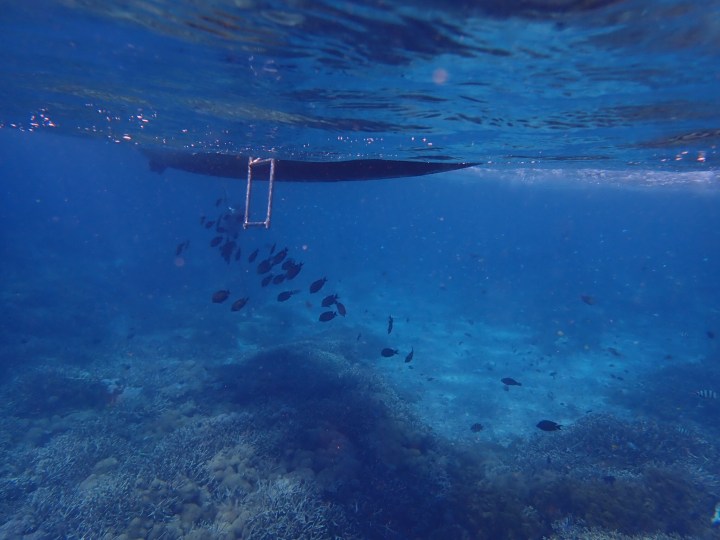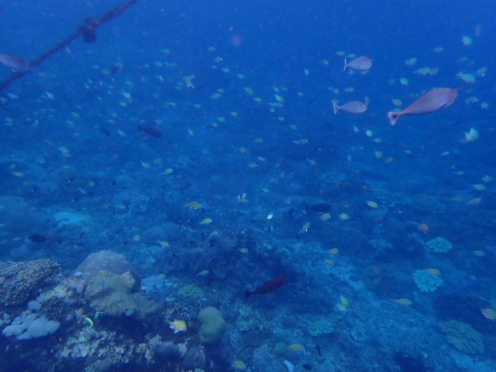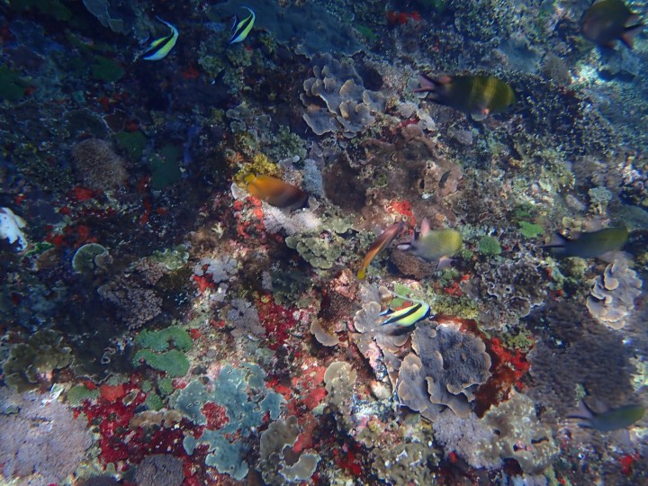 Dritte Station war an der Ecke von Nusa Penida: Die Sicht war klar und das Licht brachte die Farben der Korallen wunderbar zum Leuchten. Claude und ich liessen uns langsam von der Strömung an den Klippen entlang treiben. Das Wasser war hier ruhig. Die Mädchen derweil vergnügten sich auf dem Boot, das immer parallel zu uns fuhr. (Beide Mädchen trugen Schwimmwesten). Sie knabberten gemütlich ein paar Gützlis.