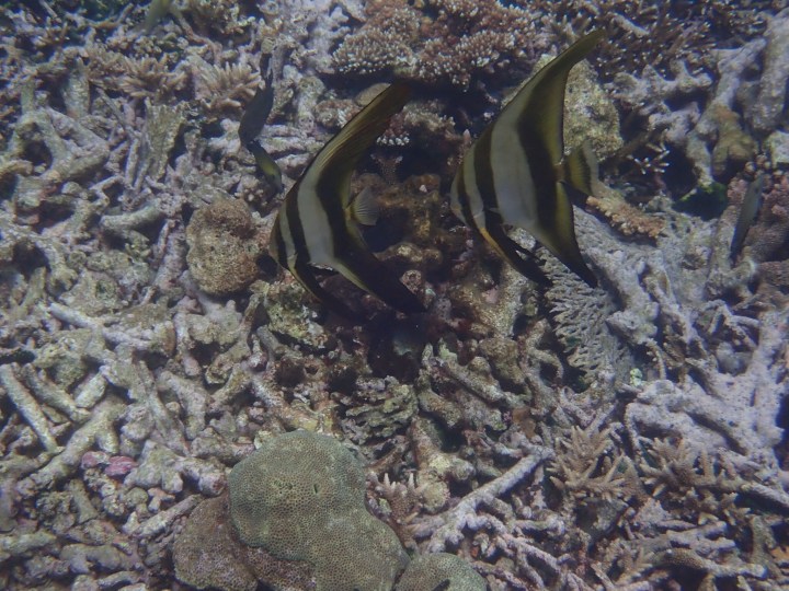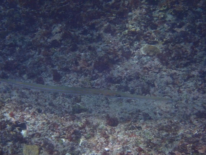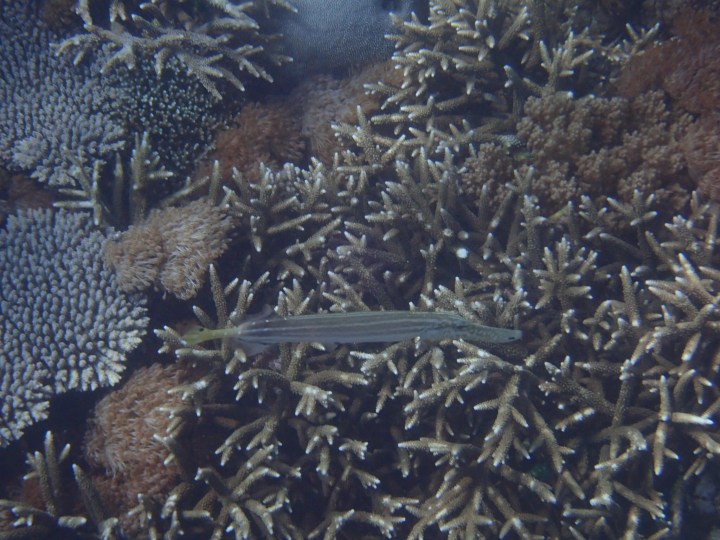 Oben: Ein Trompetenfisch (Wir sahen auf Menjangan auch eine gelbe Variante)