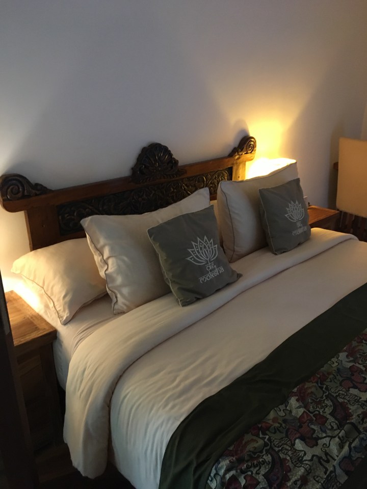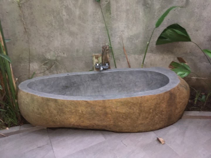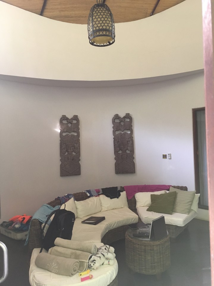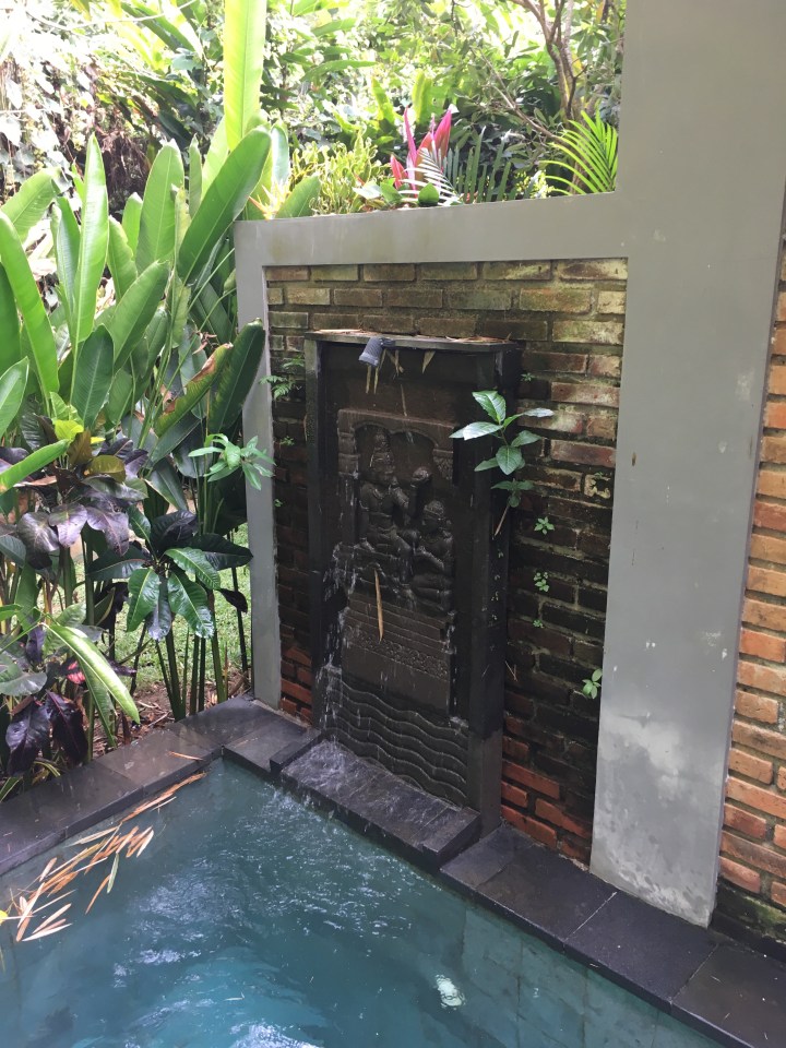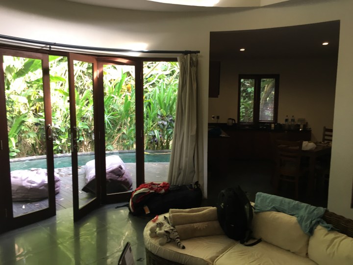 Nach der ca. 30 minütigen Bootsfahrt wurden wir bereits von unserem Taxifahrer erwartet. Mit ihm fuhren wir von Sanur quer durch Denpasar nach Tanah Lot. Hier leben wir in der Abgeschiedenheit zwischen Reisfeldern in einer wunderbaren Villa mit eigenem Pool, 2 Schlafzimmer, 2 Badezimmer, Küche und Wohnzimmer. So viel Platz hatten wir schon lange nicht mehr.