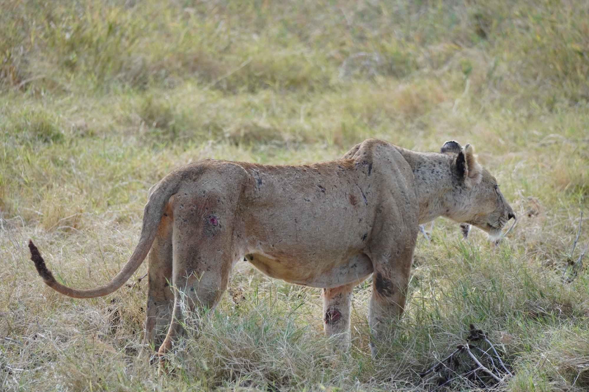 Nach kurzer Zeit entdeckten wir eine stark mitgenommene und abgemagerte Löwin. Meist geht es nicht anders als innezuhalten und diesen majestätischen Tieren einfach mal einige Minuten zuzuschauen.