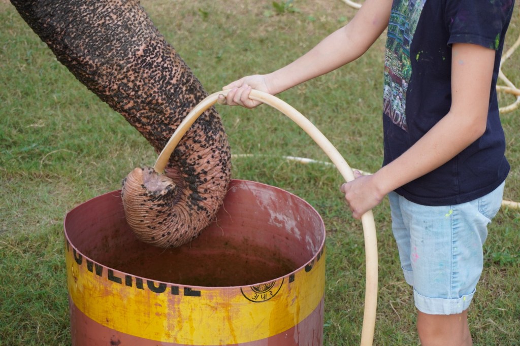 Am Ende galt es den Elefanten wieder von der Farbe zu befreien und er liess es sich nicht nehmen uns auch etwas zu duschen.