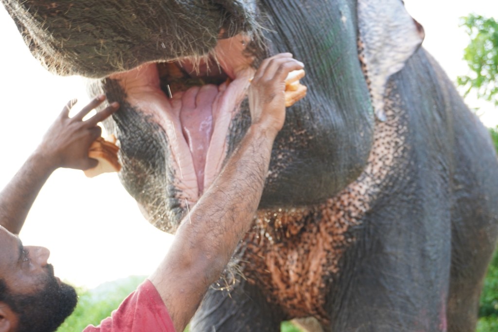 Beim Kennenlernen gehörte das Füttern von Zuckerrohr dazu, was die Lakshmi bergweise essen konnte. Kunststück ein Elefant dieser Grösse und Alter isst 150-200kg Nahrung und trinkt ebensoviel Liter Wasser pro Tag.