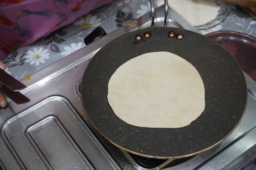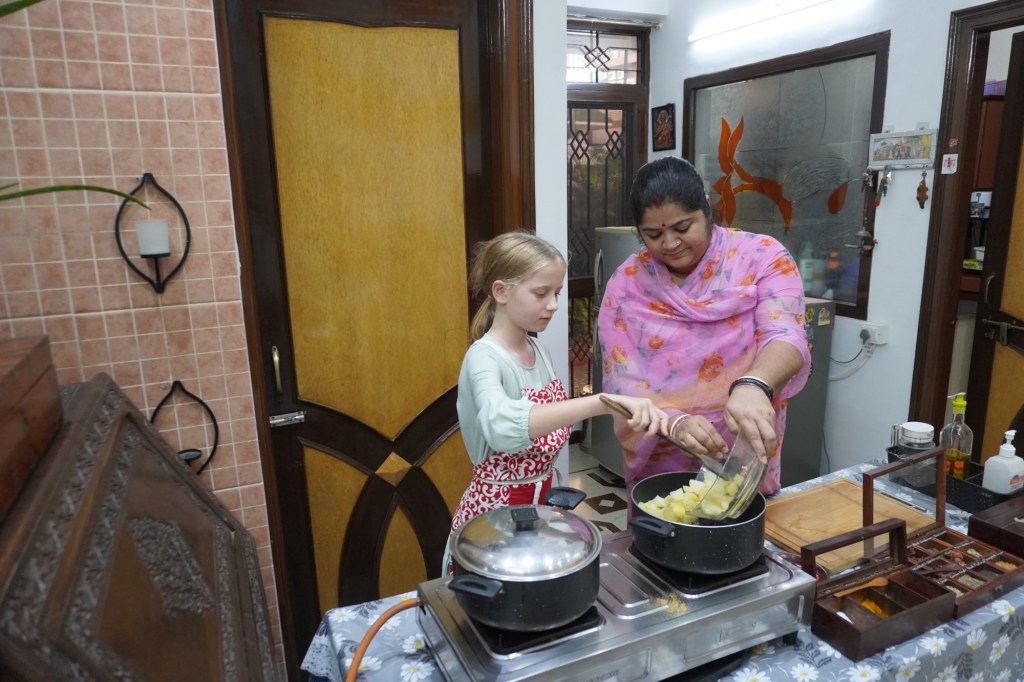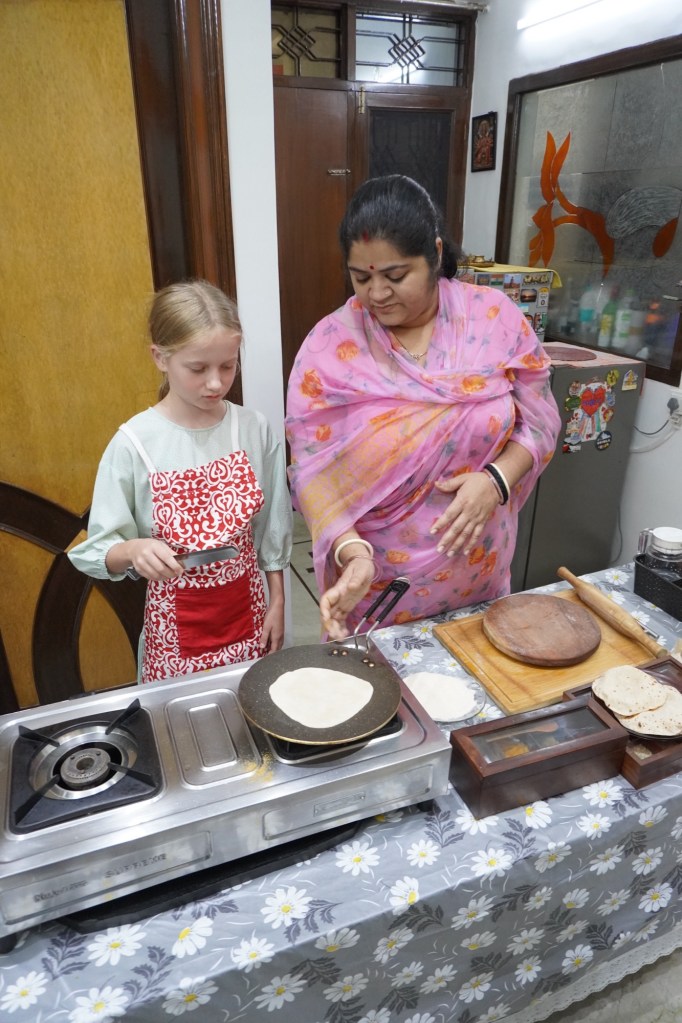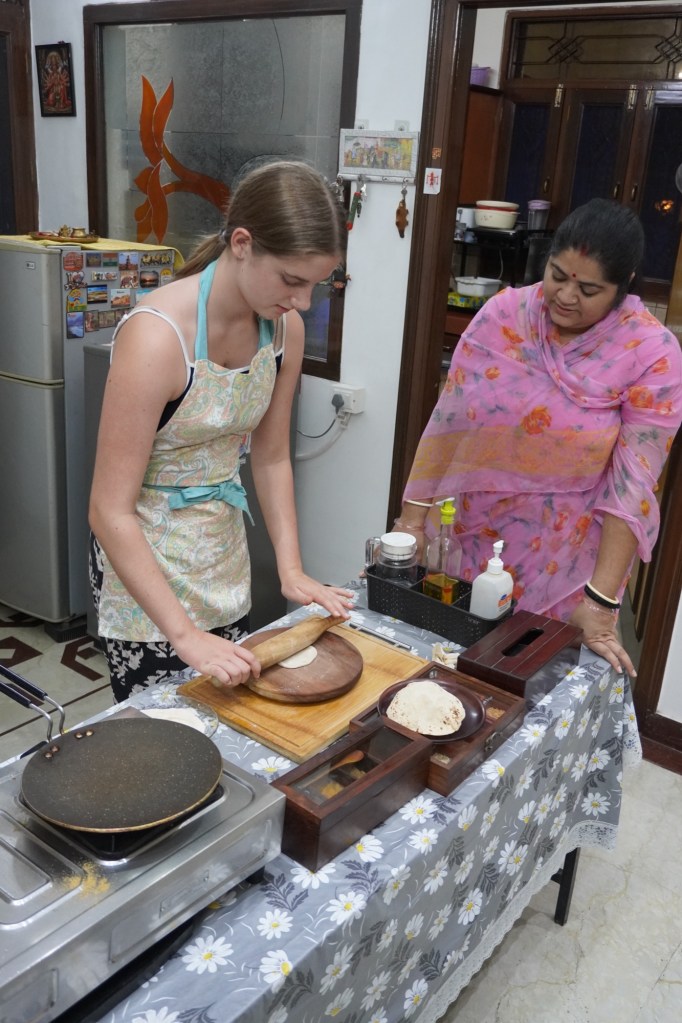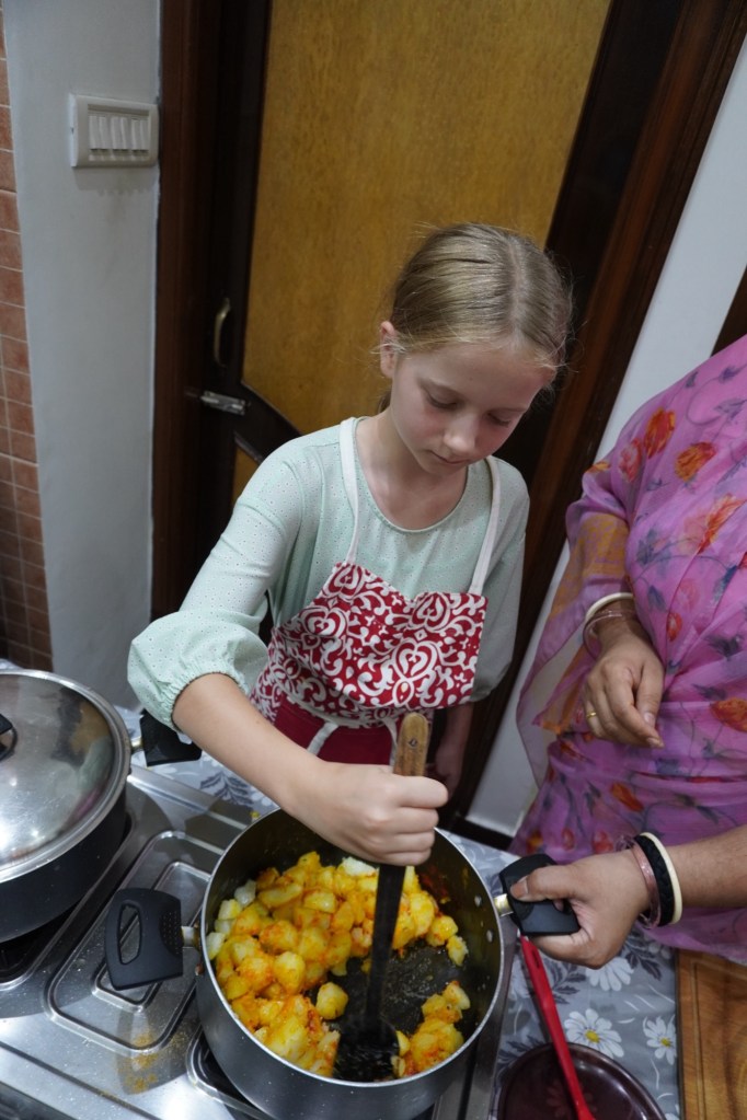 Josephine kochte Chicken Curry nach Radjistani Art. Gioia war für die Kümmel Kartoffel zuständig. Annina kochte ein Auberginegericht und ich ein Linsendaal. Zum Schluss lernten wir noch wie mal Rotis (eine Art Naan aus Vollkornmehl) macht.