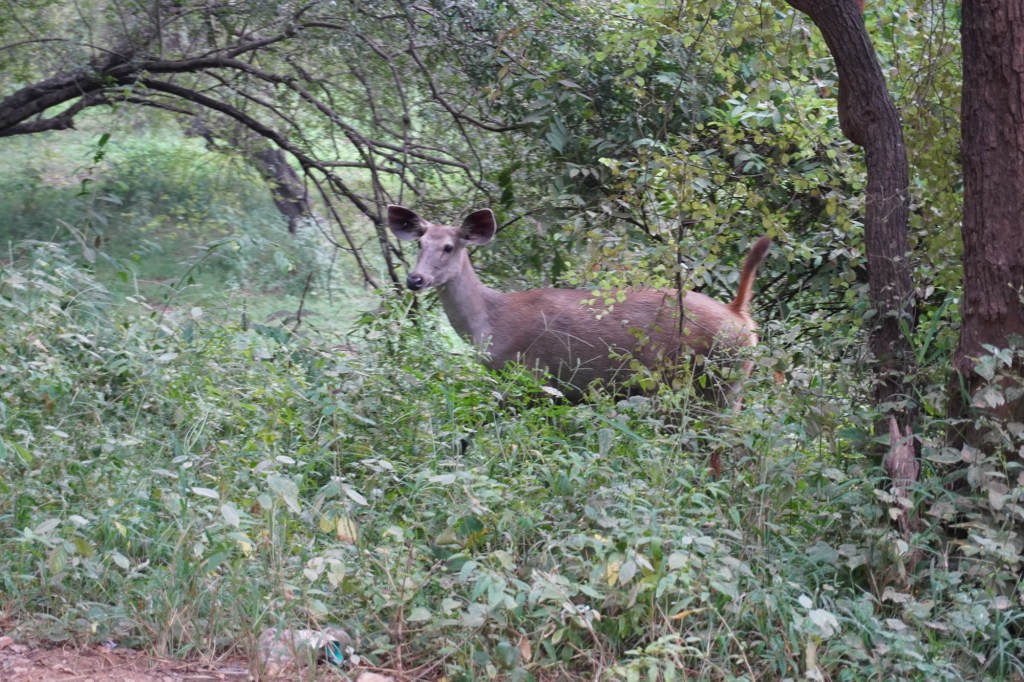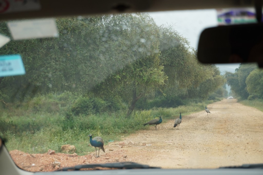 Etwas vor 12:00 startete unsere rund 2h stündige Reise. Auf Google Maps konnte ich unsere Reiseroute schön mitverfolgen und war etwas irritiert über die gewählte Route. Ca. nach drei Stunden Fahrt erreichten wir ein Gate des Reservats. Ab dort kamen wir unserem Ziel nur noch mit 10-20km/h näher. Dafür gab es Affen, indische Reh und Kühen und vielen Pfauen vorbei