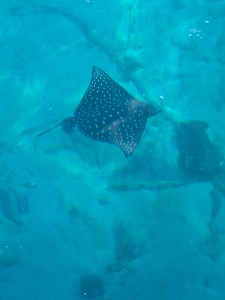Heute Morgen um 07.00 verliessen wir mit dem Schnellboot die Hauptinsel Malé in Richtung Kamadhoo Island. Direkt beim Pier kam uns noch ein Baby-Adlerrochen auf Wiedersehen sagen. Was für eine Überraschung.