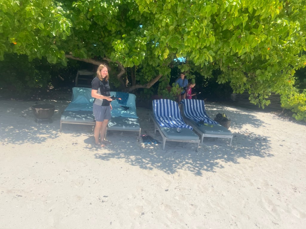 Nachdem uns unsere Zimmer zugewiesen worden waren, stürzten wir und in strandtaugliche Kleider und liessen uns von Ihu unseren Privatstrandabschnitt mit eigens für uns bereitgestellten Liegen zeigen.